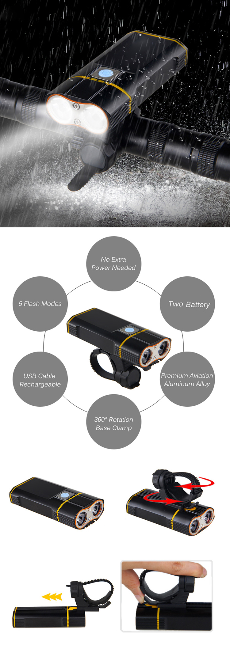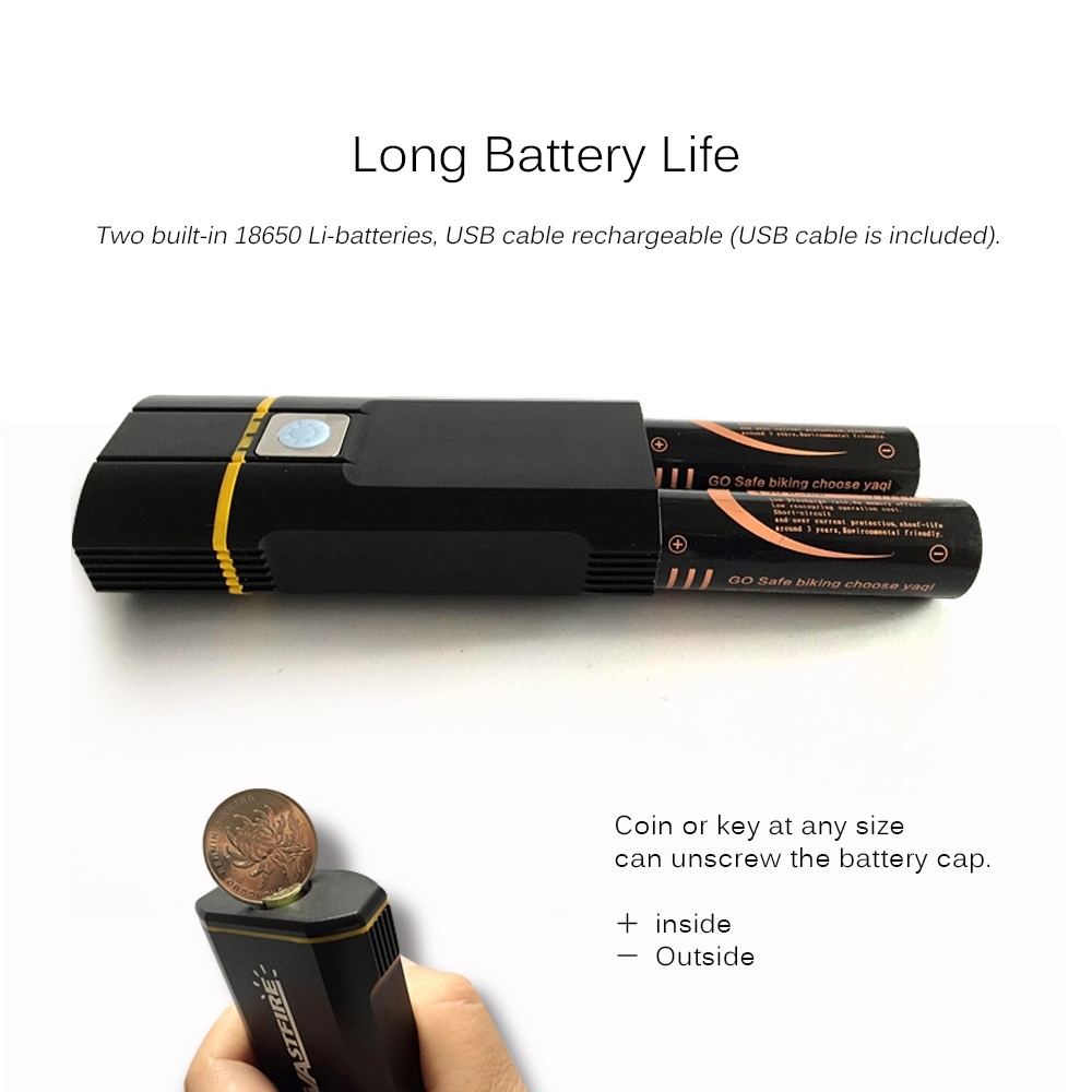-USB RECHARGEABLE: La biciklolumo venas kun inteligenta ŝarga teknologio.Du 2500mAh 18650 Li-baterio kaj ŝargkablo estas inkluzivitaj.Vi ne bezonas malŝpari monon aĉetante kromajn bateriojn.