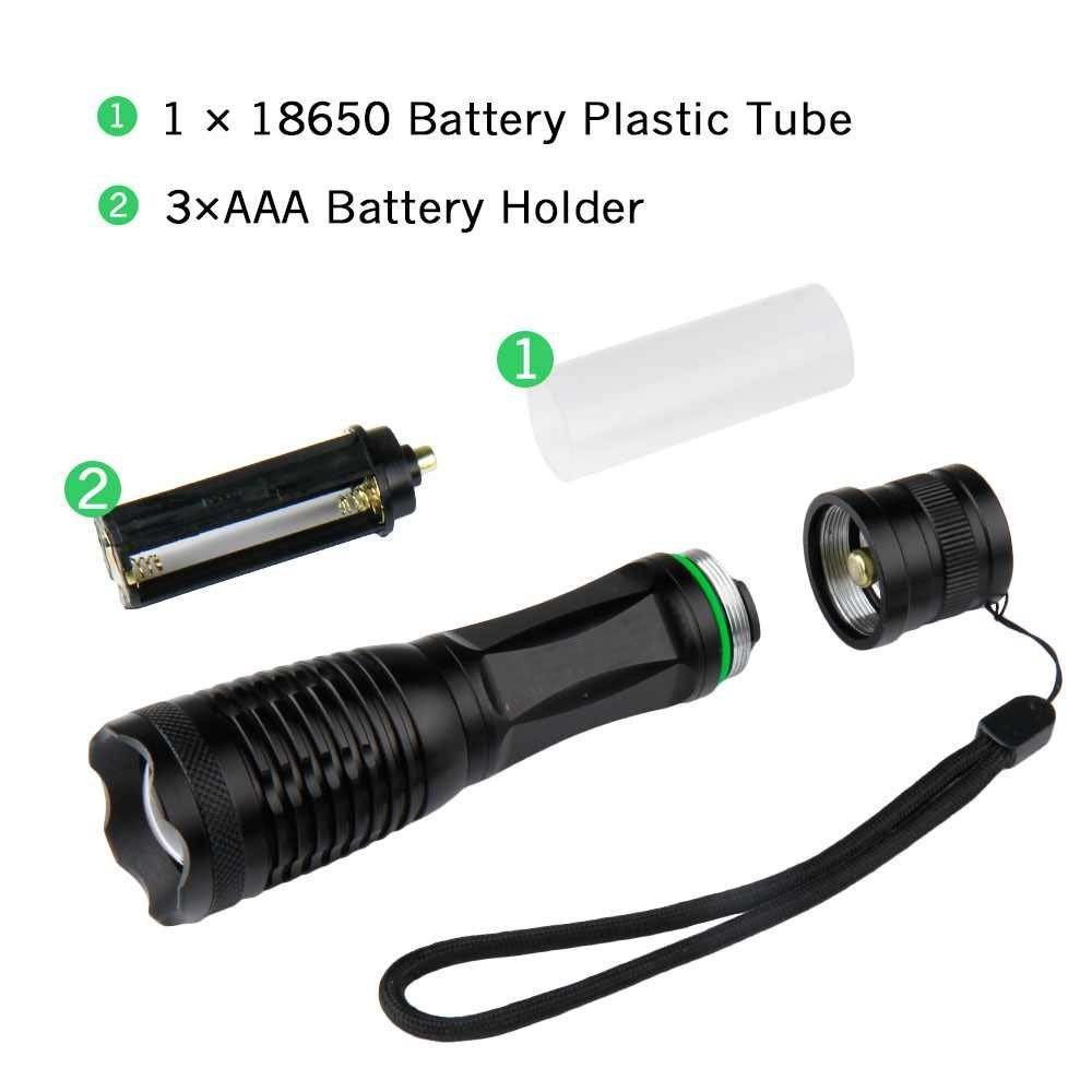 8. The flashlight can endure rough handling and resist rust and corrosion. IP65-rated water resistant and designed for use in heavy rain. Water resistant from splashing water. It’s perfect for use in the rain, snow or emergency situations. 9. Smart design: pocket-friendly compact chassis with an anti-slip finish holds fast in your hand or stands on-end as an emergency lamp. Small enough to fit in your pocket, handbag, drawer, or car compartment. Great for camping, hiking, fishing, running, dog walking and emergencies. Takes 3 standard 3AAA or a single 18650 rechargeable battery. (Batteries Are Not Included)