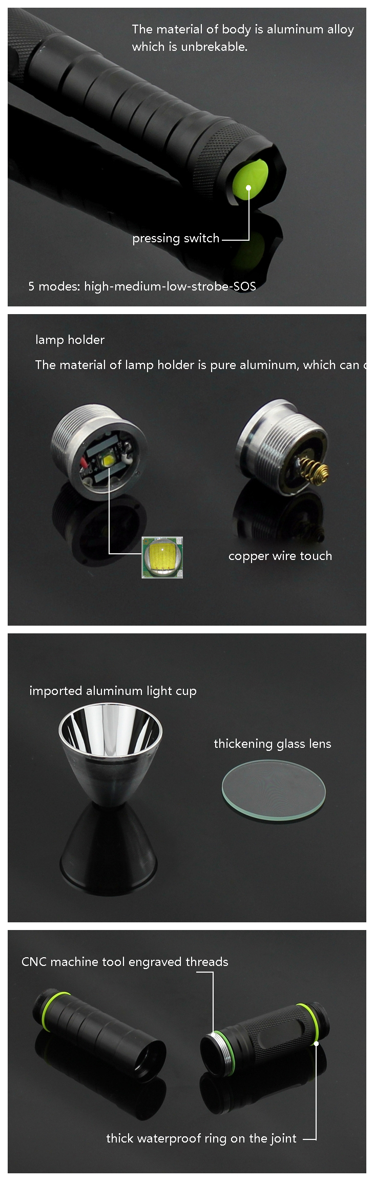 * Met die lig aangeskakel, druk liggies (geen klik) die stertdop-drukknoppie-skakelaar, die helderheidsvlak sal tussen 5 modusse (Max, Mid, Min, Strobe, SOS) wissel.
