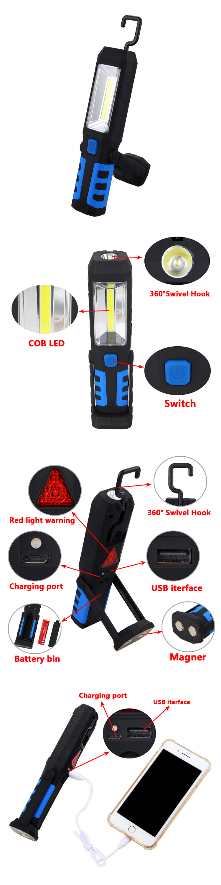 COB LED Warning Working Lamp USB Rechargeable 3 Modes 360 Degree Stand Hanging Hook floodlight Dry Battery magnetic work light