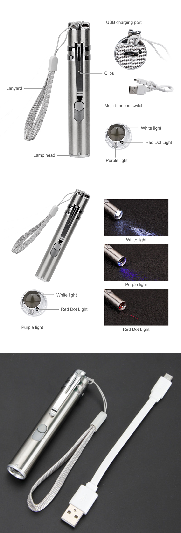 | Koloro de lumo: | 3 Reĝimoj (ruĝa + purpura + blanka) |