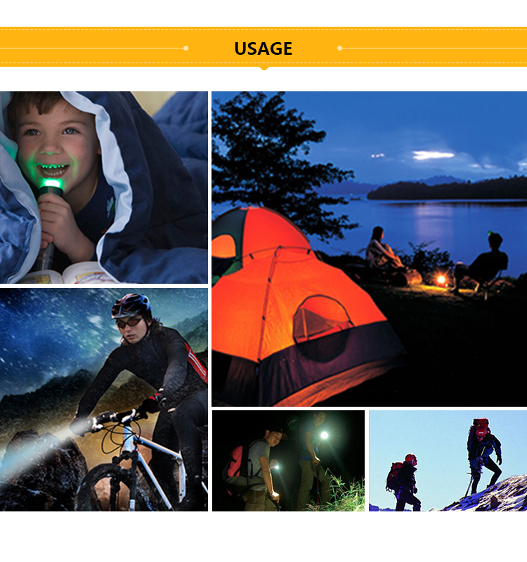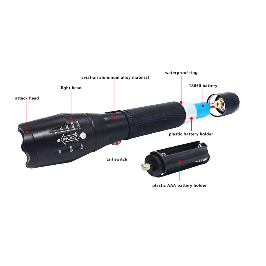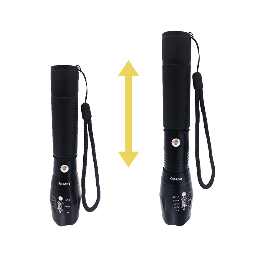 -5 modos de luz:alto/medio/bajo/estroboscópico/SOS;Con botón ON OFF, fácil de operar.Función Zoom;Perfecto para caminatas, campamentos, búsquedas específicas y uso doméstico general.