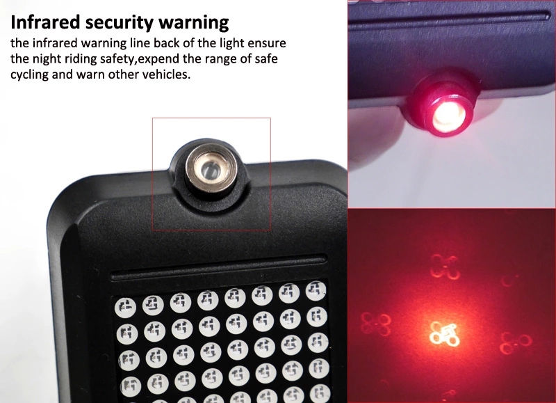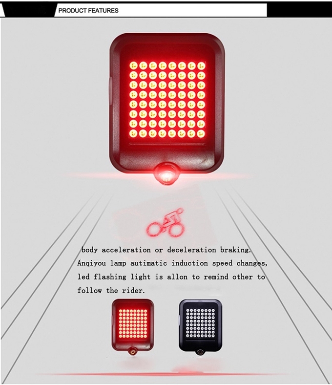 Kada vozite bicikl, ako koristite kočnicu, infracrveni senzor bi poslao poruku svjetlima i sva 64LED svjetla bi se automatski upalila i bljesnula šest puta kako bi upozorila vozila iza vas.