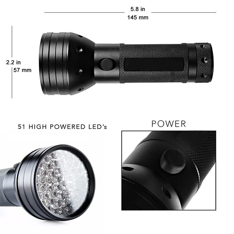 UV Tracker 51 51 ультракүлгін жарықдиодты шамдармен мақтана алады, бұл көптеген бәсекелес УК шамдарынан көп.Көбірек шамдар сіздің айналаңызды тиімді тексеруге мүмкіндік беретін көбірек қамту аймағын білдіреді.
