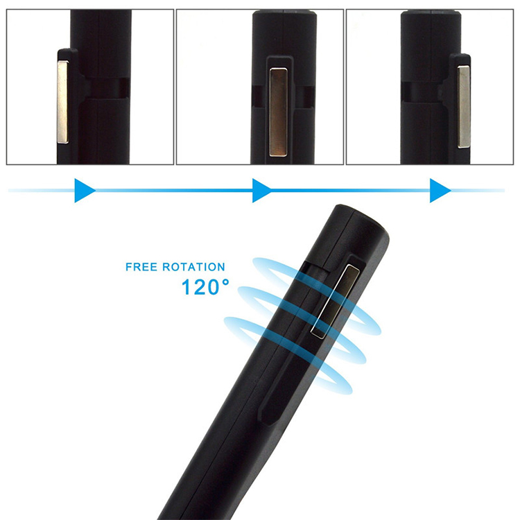 4. Equipped with magnet and 3-grade 120°rotation clip, can stick it to the metallic surface or clip it on any place for hands-free operation.