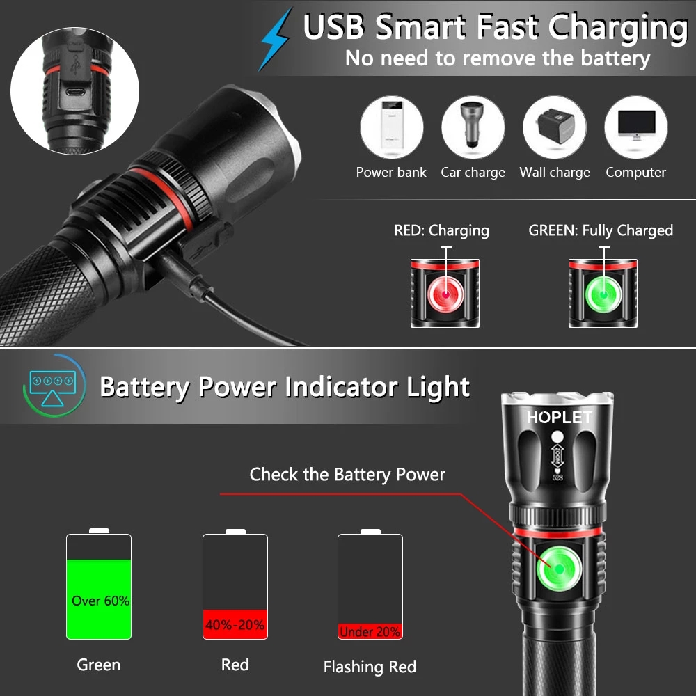 Resistant Flashlight 5 Modes XHP50 LED Torch USB Rechargeable Torch High Power Tactical Military Torch