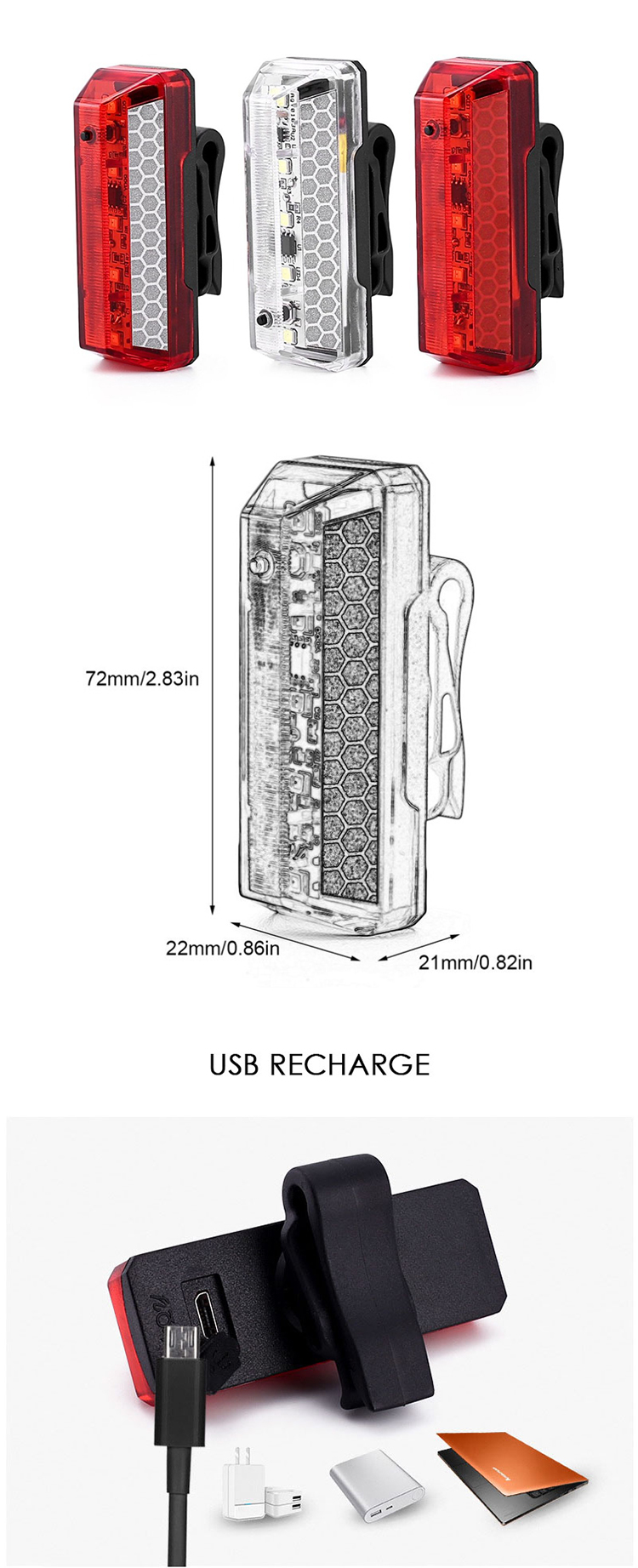 Ambalare: 1* Lumină spate USB pentru bicicletă 1* cablu USB 1* clemă pentru stop