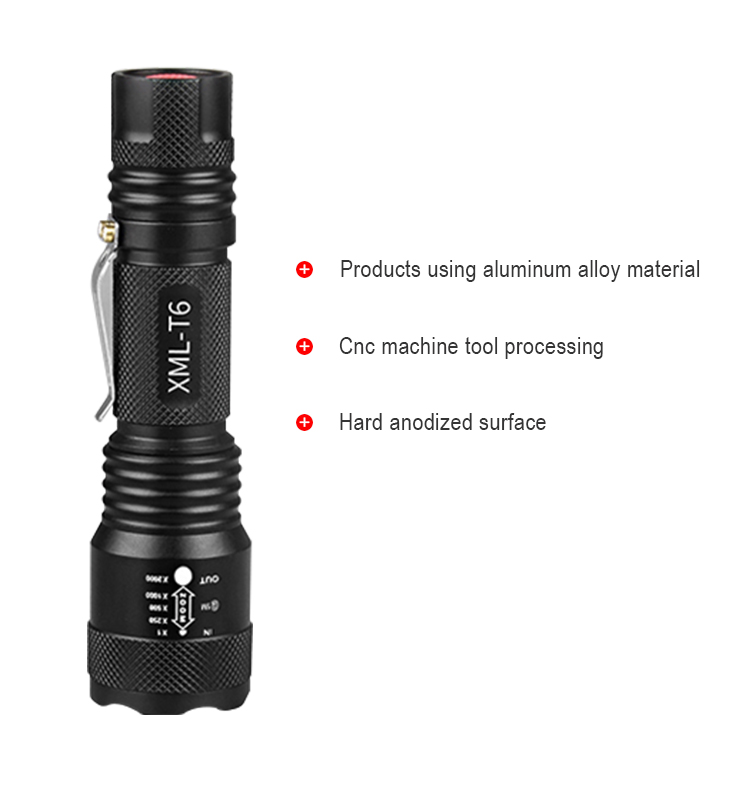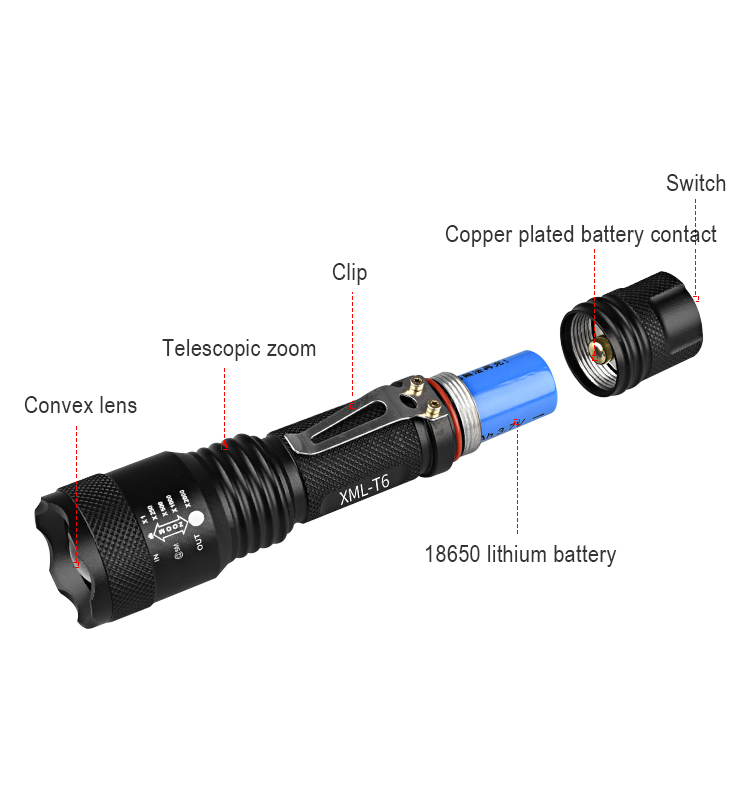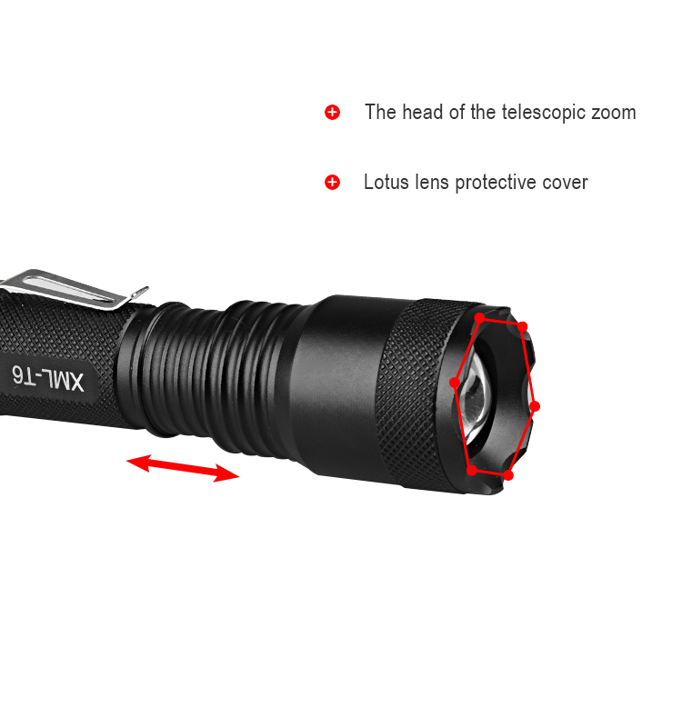 Super brightest xml T6 LED Aluminum Zoomable Waterproof Hunting Fishing Camping Torch 18650 rechargeable High Power Flashlightled focus flashlight package(light without battery ):single packing:1*flashlight; 1*white box; bubble pack