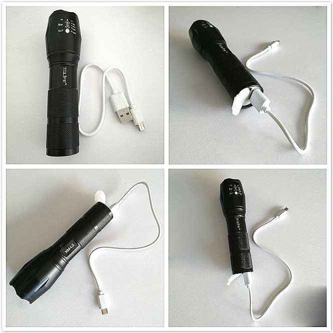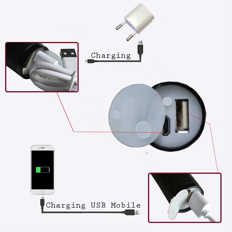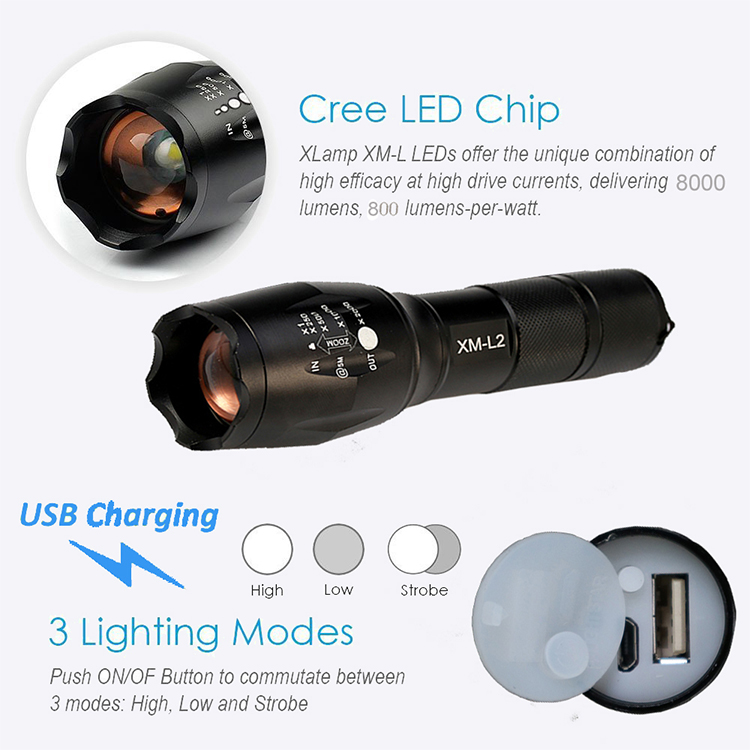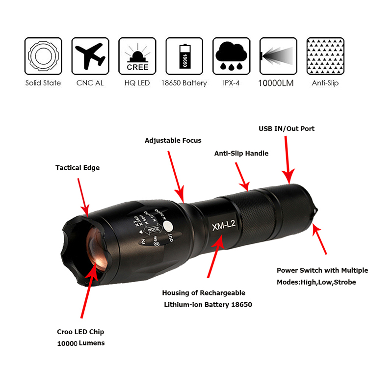HEAVY DUTY:Vattentålig, antinötande, halksäker, kompakt design och med USB-port gör den till den övre ficklampan för taktiska situationer,utomhusaktiviteter, camping, vandring, jakt, fiske, hemmabruk och som ett kraftfullt nödljus.