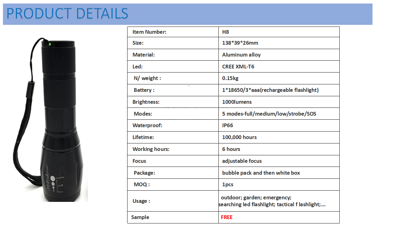 3, kylning färdigheter: ficklampa i bruk, för att säkerställa att värmen.Uppmanas starkt att batteriet är fulladdat, bra först med andra växeln, så att ficklampan kan förlängas lampans livslängd och batteritid!Kan inte vara ficklampa direkt till mänskliga ögon, för att inte påverka synen, särskilt barn.